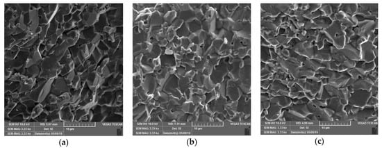 SEM images of alumina morphology sintered at 1550 °C with fixed weight ratios of waste alumina powder of 20 wt.%, 0.05 wt.% Tiron and 0.1 wt.% PVA and with varying amounts of magnesium aluminate spinel: (a) 0.2 wt.% MgAl2O4, (b) 0.6 wt.% MgAl2O4 and (c) 1.0 wt.% MgAl2O4 expressed on dry weight basis.