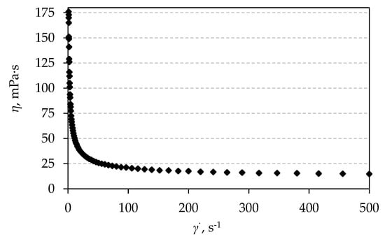 The obtained results showed that the apparent viscosity of the suspension decreases while the shearing rate increases (Figure 4). This is a characteristic of the non-Newtonian fluids, or more precisely, the pseudoplastic behavior of fluids [].