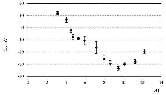 The isoelectric point (IEP) of the zeta potential means that the potential is zero, i.e., there isn’t any electric charge present on the particle surface. The IEP was determined at a pH value around 4.5 for the investigated optimal composition. The stability of suspensions, i.e., the zeta potential value > 30 mV, was achieved when the pH value of the suspension was between 8–11. The magnitude of the negative zeta potential value was higher and extended in the alkaline pH range, which can be attributed to impurities from waste alumina powder [].