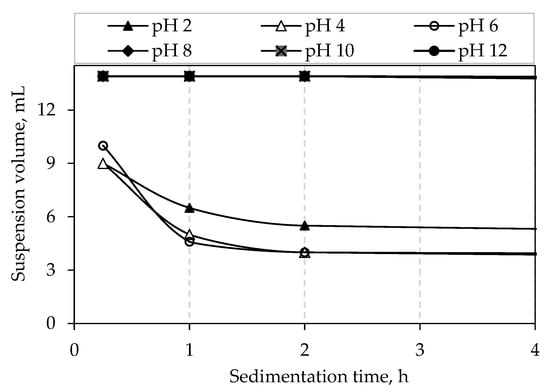 The sedimentation test was carried out in order to validate the electrophoretic measurements, i.e., the zeta potential measurements. The dispersion height measured during the sedimentation test decreases rapidly if the optimal pH value of the suspension is not reached. As it was shown in Figure 5, the alumina suspension with the optimal amount of additives was stable in the pH range from 8–11. After the optimal pH value is achieved, the dispersion height typically remains constant for a certain period of time and then slowly decreases []. The sedimentation tests, based on visual observation of the suspension sedimentation consisted of recording the sediment volume after 15 min and then after 1 and 2 h and after 1, 2, 3, 4 and 7 days. The suspensions with the optimal amount of additives, but which were in the pH range below 8, have started to sediment rapidly (Figure 6). On the other hand, the suspensions that had the pH value of 8, 10 or 12 have not showed almost any sedimentation in the first two hours after the preparation. Some plot markers overlap in the upper segment of Figure 6.