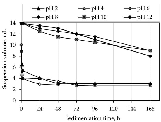 After 72 h the sedimentation process was completed for the suspensions with the pH values below 8, which suggests highly unstable suspensions. The suspensions which were in the pH range above 8 showed a reasonable stability after 72 h. For these suspensions a complete sedimentation was not observed even 7 days (168 h) after the preparation (Figure 7).
