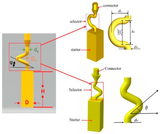 The 2D selector is composed of a starter block, a selector portion and a connector. In the research, the starter had a quadrangular shape with parameters of 10 mm (L) × 10 mm (W) × 30 mm (H). As it is shown in Figure 1.