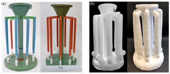 To study the influence of the shape of the selector on the grain selection, the wax bar composed of 2D grain selectors in different sizes and the cylindrical rod with 20 mm (D) × 150 mm (H) were injected as a whole. The parts were arranged around a center of gravity, forming a wax mold. Then, the wax group was immersed in a water-based ceramic mortar with different viscosities and painted with alumina mortar of different sizes. We repeated the whole processes until the shell mold wall thickness was up to 7–8 mm. After drying, the mold patterns were dewaxed. Thereafter, the mold was then sintered to remove the remaining wax and the shell strength was increased. The wax model and shell mold are shown in Figure 3. At last, the shell mold was mounted on a water-cooled copper cooler in a Bridgman furnace. In the process of investment casting, the shell mold was raised to a cylindrical heater, and heated to 1470 °C. After equalizing the furnace temperature, the melted alloy was heated to 1500 °C and poured into the mold. The mold was withdrawn from the furnace for the grain growth in a rate of 3 mm/min. As the temperature of the heater dropped below 300 °C, the vacuum was released, and then the mold was removed. Finally, we knocked out the mold and the units and cluster were separated.