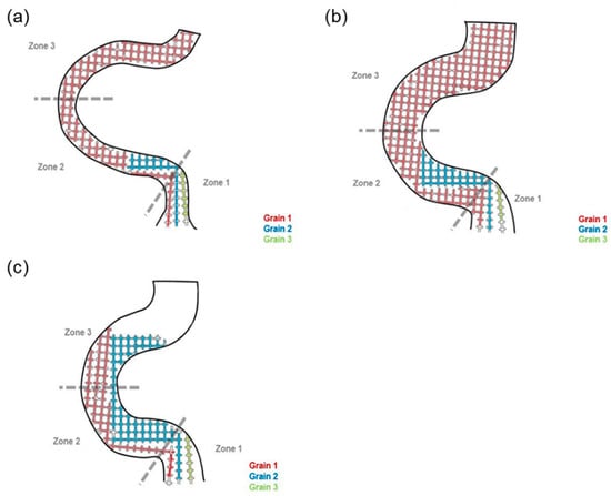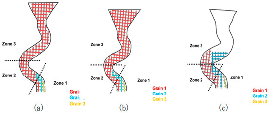 Grains (1, 2, and 3) growth and selecting in grain selectors varying in the take-off angle: (a) 15°, (b) 30°, and (c) 40°.