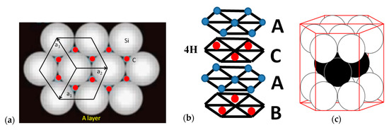 (a) Stacking sequence ACAB of 4HSiC crystal: red dots indicate the position of the following atomic layer shown in (b) at layers C and B; (c) 3D perspective of three initial layers.