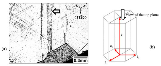 (a) Optical micrograph of etch pitch bands —(0001) face—of a 4HSiC wafer with bands along directions <110>; (b) theoretical structure of SiC hexagonal polytype with a1 = a2 = a3.