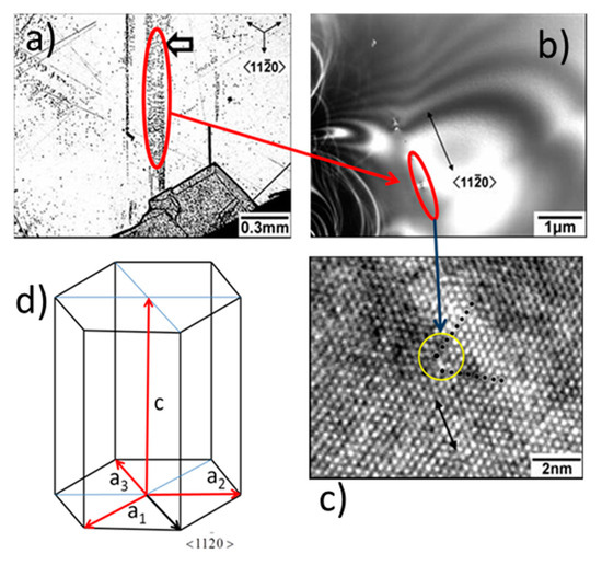 Dislocation gliding in the slip system during post-growth cooling: (a) Optical micrograph; (b) electron microscope image of red circled region; (c) HRTEM pattern of crystal (dark dots correspond to extra-atomic planes); (d) theoretical structure of the SiC crystal with a1 = a2 = a3 and dislocation’s Burgers vector oriented as a3.