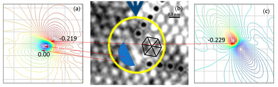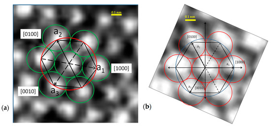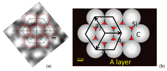 A small squared region containing the elementary cell was cropped from the original image (Figure 3c), far from the dislocation region. Bicubic spline interpolation of pixels was performed to obtain the scale of Figure 5a. The red circles in the figure correspond to spheres of radius r = a/2 = 0.3073/2 = 0.1537 nm, one half of the SiC’s lattice parameter a = 0.3073 nm at 300 K. Using this parameter, the corresponding hexagon connecting centers of spheres can be sketched.