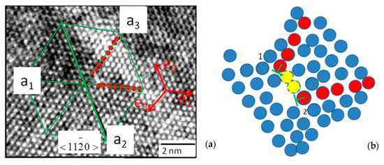(a) Crystallographic directions ≡ a2; (b) Schematic representation of atomic positions in the neighborhood of edge dislocations (yellow dots are clarified later in the article).