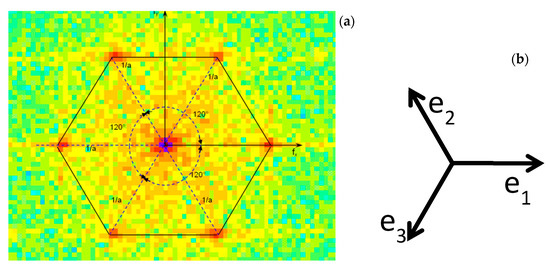 Figure 6 shows the FFT of the crystal’s HRTEM pattern of Figure 3c. The direction fx represents the family of crystallographic directions a1 = [1000] (see Figure 5a). The scale of Figure 6 is Sf = (0.0111) 1/nm per pixel. Figure 6 gives a statistical spatial average of frequency changes of elementary cells in the analyzed region. This means that Figure 6 is a graphical representation of the ensemble of the spatial frequencies of the RVE of the observed area. The hexagon shown in Figure 6 represents the average amplitude of a = 3.073 Å at 300 K. The changes in hexagon’s corners positions with respect to the average position indicated in Figure 6 reflect distortions of elementary cells caused by dislocations. Figure 4 represents the elementary undeformed cell for which the atomic vector a is constant. The a vector reflects the spatial configuration of atomic bonds binding together atoms. Since atoms continuously oscillate under thermal excitation at the T temperature, a is a statistical average over time. Figure 6 shows that the a vector is modified by the deformations caused by the dislocations. In the 2-D analysis, changes experienced by the elementary cell can be analyzed by superposing different changes in dimension and orientation of a.