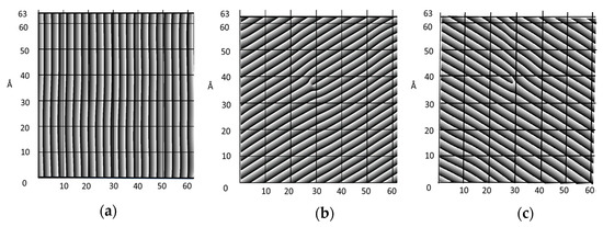 In Section 4, it has been mentioned that the two approaches adopted in this paper to extract displacement information were the analysis of the elementary crystalline cell and a field approach. This section is devoted to the development of the second approach. Figure 10 is obtained from Figure 6a, filtering selected orders at the corner of the hexagon and computing the inverse FFT. A system of three fringe patterns at 120° of each other is obtained and in Figure 10 the wrapped phase patterns are plotted.
