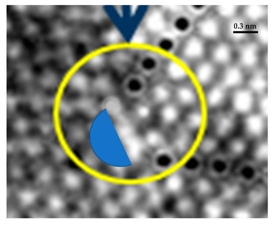 In Figure 11, the black dots represent the two extra rows of atoms. The next row of atoms that follows the end of the dislocation rows shows a bright area where the position of the atoms is not well defined. The blue area that follows this row outlines a region where the light intensities indicate a cavity, area where there is not a discernible atomic structure. Figure 12a summarizes the preceding analysis; the yellow dots correspond to atoms that are under compression, the parameters ai are reduced. The region including green circles is under tension as shown in Figure 9a: parameters ai are increased. The region indicated as shear region corresponds to cases shown in Figure 7c,d.