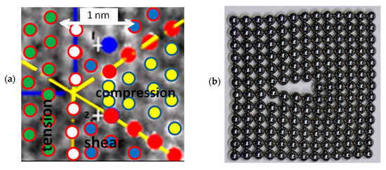(a) Locations of atoms in the crystal region with the dislocation; (b) simulation of the presence of a dislocation using magnetic spheres [36].