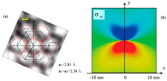 (a) Representative hexagon at the dislocation edge; (b) typical stress distribution σxx for a Volterra’s type dislocation [37]. The peak tensile stress (red) is 5 GPa; the peak compressive stress (blue) is −5 GPa.