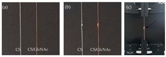 Uniaxial tensile testing was used to characterize the mechanical properties of the CS and CS/GlcNAc filaments. Experiments were conducted on a mechanical properties testing apparatus (Instron Model 6633) (Norwood, MA, USA), equipped with a load cell of 500 kN, under ambient conditions, where the temperature was 24 ± 2 °C with a relative humidity of 60% ± 2%. The filaments, non-knotted (Figure 2a) and knotted (Figure 2b), were tested in a dry condition (dry), and under incubation conditions (wet), with the filament soaked for 5 min in PBS at 37 °C, so as to mimic the in vivo conditions, and the tests carried out 2 min after removing the filaments from the fluid, according to the United States Pharmacopeia absorbable suture testing standards. Each filament was subjected to tensile forces at a separation rate of 2 mm/min until failure occurred, according to ASTM D2256 standard. Failure was defined as the breakage of the filament, and the tensile strength or tension at failure was defined as the tensile force (N) measured at failure. The resulting load–displacement data collected by the digital acquisition system were converted to stress–strain data in order to calculate the tensile force (N), percentage strain to failure, and elastic modulus. All of the knots were tied wearing surgical gloves, and they were tied by a single investigator over multiple sessions so as to avoid any variation in the knot strength because of surgeon fatigue. The filaments were placed in the Instron machine with the knot approximately midway between the clamps (Figure 2c). The data are expressed as mean ± standard deviation for ten determinations. The data were evaluated using analysis of variance (ANOVA), and the significance of the model was verified with the t-test, with a significance level of 95% (p < 0.05) using Action Stat Quality® software (3.5.152.34 Version, EstatCamp Company, São Carlos, Brazil).