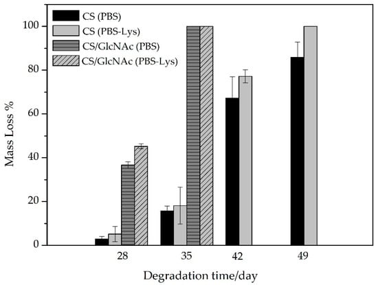 Mass loss of CS and CS/GlcNAc filaments as a function of the degradation time.
