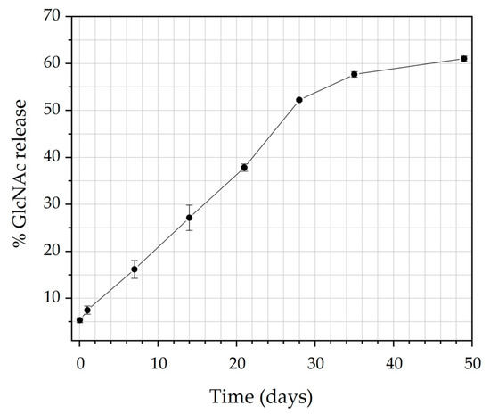 The in vitro release behavior of N-acetyl-D-glucosamine (GlcNAc) from CS filaments was assessed at 37 °C in phosphate buffered saline (PBS) as a simulation of the body fluid at a pH of 7.4. Figure 7 shows the percent release of GlcNAc from CS filaments against incubation time. As can be noted from this figure, 7.4% of the GlcNAc was released within one day, and 16.1% within seven days. The relatively low “burst effect” of these filaments is presumably due to the preferential location of the GlcNAc molecules within the deep sections of the CS filaments. As showen in the SEM images presented previously (Figure 3), the GlcNAc crystals could not be observed on the CS filament surface and cross-sectional. Moreover, the strong interaction between CS-GlcNAc, as suggested by the XDR data (Figure 4), may have resulted in a slow desorption of the drug from the filament, and this can reduce the initial burst release effect of the drug. The advantage of this liberation system is avoiding negative consequences, such as the local toxicity from high drug concentrations [78]. Notice that a more pronounced release takes place after 21 days. Indeed, until 21 days, only the swelling of the CS filaments occurs (at 7, 14, and 21 days, the mass gain was 128.4%, 116.5%, and 112.8%, respectively, for the CS filaments in PBS, and was 113.0%, 135.6%, and 101.5% for the CS/GlcNAc filaments), allowing for the aqueous solution to penetrate through the chitosan, resulting in the diffusion of GlcNAc to the medium. After 21 days, as a result of the extended contact of the polymeric matrix with the surrounding medium, the polymer degradation starts to take place (Figure 5), allowing for the remaining drug to be released. About 61.0% of the loaded drug from the CS filaments was released in 49 days.