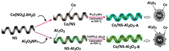 For the synthesis of 15 wt% Co/NS-Al2O3 catalyst, two types of catalysts were prepared in this study (Figure 1). The process for preparing the first type (A) of Co/NS-Al2O3 catalyst was by impregnating an aqueous solution of Co(NO3)2·6H2O (88 mg in 15 mL of water) onto the NS (100 mg in 15 mL of ethanol) support at room temperature. Then, the solution of Al2O3 gel (47 mg) was added dropwise to the Co/NS and labeled Co/NS-Al-A. The second type (B) Co/NS-Al2O3 catalyst was made by adding a solution of Al2O3 gel (47 mg) onto the NS (100 mg in 15 mL of ethanol) support at room temperature, as described by the chemical Equation (3) as follows: