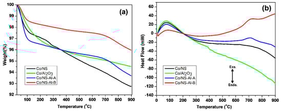 Thermogravimetric analysis (TGA) was carried out to determine the thermal stability of the calcined Co/NS, Co/Al2O3, Co/NS-Al-A and Co/NS-Al-B catalysts. The TGA thermograms of the calcined Co/NS, Co/Al2O3, Co/NS-Al-A and Co/NS-Al-B catalysts (Figure 2a) indicates that the overall weight loss up to 900 °C were 6.9%, 6.3%, 5.4% and 4.0%, respectively. The first stage mass loss (about 3%) of all catalysts occurred between the temperature range of 30–150 °C, which is likely due to evaporation of adsorbed water, solvent and organic compounds on the catalysts; this is supported by an exothermic peak in the DTA thermograms (Figure 2b) [,]. Weight loss was observed above 600 °C and can be attributed to complete removal of material during calcination. This weight loss corresponds to an exothermic peak between 600–800 °C observed by DTA for the Co/NS-Al-A and Co/NS-Al-B catalysts (Figure 2b). Both the TGA and DTA analysis of all the catalysts exhibited some minor decomposition up to 900 °C, which clearly implies that all of the catalysts in this study have good thermal stabilities.