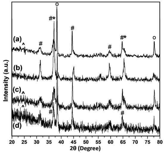 X-ray powder diffraction (XRD) patterns for the calcined of catalysts: (a) Co/NS-Al-B, (b) Co/Al2O3, (c) Co/NS-Al-A and (d) Co/NS catalysts. (*) CoAl2O4; (#) Co3O4; (^) SiO2; and (o) Co.