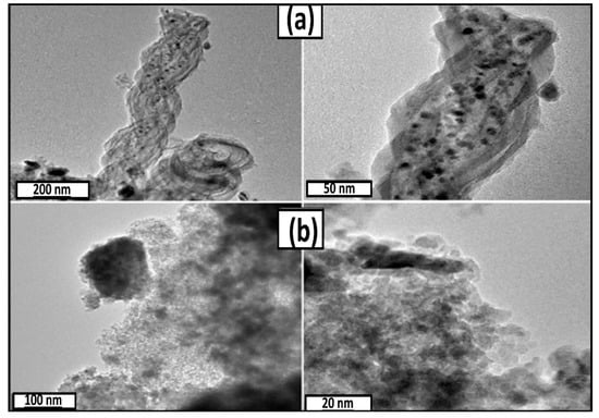 The microstructures and morphology of prepared catalysts (dispersed in ethanol and applied to a copper grid coated with carbon support film) was characterized by TEM (JEOL JEM-2100 or JEM-2010, JEOL USA Inc., Peabody, MA, USA), operated at 200 kV. The cobalt particle size (dTEM) from TEM micrographs was measured using ImageJ software (version 1.52).