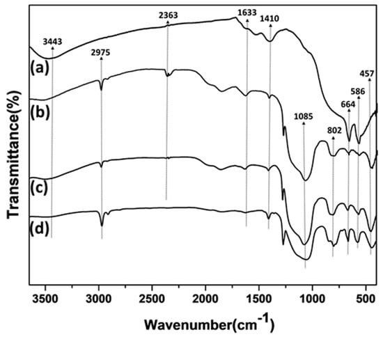 The chemistry of the catalysts was examined by FTIR spectroscopy (Figure 5). Although the FTIR spectra of the Co/NS, Co/NS-Al-A and Co/NS-Al-B catalysts were similar, some differences in intensity were observed with the addition of Al2O3. The FTIR spectra of the Co/NS, Co/NS-Al-A and Co/NS-Al-B catalysts all showed characteristic Si–O–Si antisymmetric stretching and Si–O symmetric stretching vibrations at approximately 1085 cm−1 and 802 cm−1, respectively [,]. An additional band at 457 cm−1 is assigned to Si–O–Si or O–Si–O bending vibrations. The two absorption bands at approximately 586 cm−1 and 664 cm−1 in all catalysts have been assigned to Co–O []. Moreover, all catalysts exhibit a broad band centered at 3443 cm−1 associated with O–H stretching, and a relatively weak band at 1633 cm−1 of hydrogen bonded surface silanol groups and physically adsorbed water [,,]. The spectra of the Co/Al2O3, Co/NS-Al-A and Co/NS-Al-B catalysts showed two bands at 567 and 663 cm−1, which have been attributed to CoAl2O4 [].
