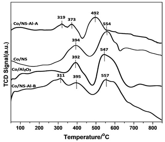 H2-TPR profiles for the Co/NS-Al2O3, Co/NS, Co/Al-A and Co/Al-B catalysts.