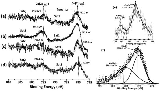 High resolution XPS spectra of the Co2p of the calcined Co/NS (a), Co/Al2O3 (b), Co/NS-Al-A (c) and Co/NS-Al-B (d) catalysts, and expanded region showing CoAl2O4 for the calcined (e) Co/NS-Al-A and (f) Co/NS-Al-B catalysts.