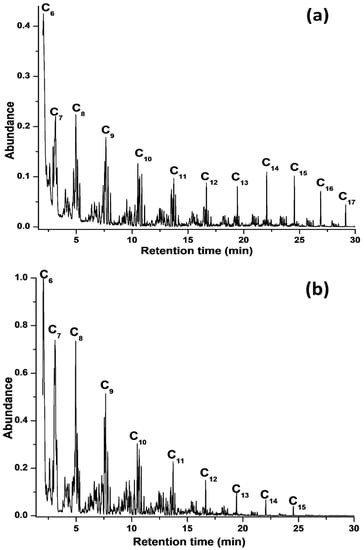 GC-MS chromatograms of FTS liquid products using the catalyst (a) Co/NS-Al-B and (b) Co/NS-Al-A.