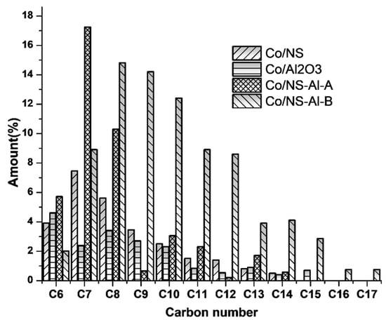 The condensable liquid fuel products were characterized by GC-MS (Figure 9), where the Co/NS and Co/Al2O3 catalysts have a hydrocarbon product distribution in the carbon number range of C6–C14 (Figure 10), while the Co/NS-Al-A and Co/NS-Al-B catalysts had hydrocarbons ranges of C6–C15 (naphtha fraction) and C6–C17, respectively (Figure 10). The FTS hydrocarbons products obtained from the Co/NS-Al-A catalyst were found to be qualitatively and quantitatively different from those produced by the Co/NS-Al-B catalyst (Table 2). The main hydrocarbon products in the C6–C15 range for the Co/NS-Al-A catalyst were olefins (23.7%), paraffins (8.9%), naphthenes (cycloalkanes) (16.9%) and aromatics (10.2%), giving it a total hydrocarbon selectivity of 58.5%. In addition, there were no oxygenated products detected for the Co/NS-Al-A catalyst. In contrast, the Co/NS-Al-B catalyst produced paraffins (16.2%), olefins (55.1%), naphthenes (12.6%) and some oxygenated products (2.4%), giving it a total hydrocarbons selectivity of 86.3%. In general, the amount of produced olefins in all catalysts was higher than paraffins. Oxygenated products were observed for the Co/NS, Co/Al2O3 and Co/NS-Al-B catalysts.