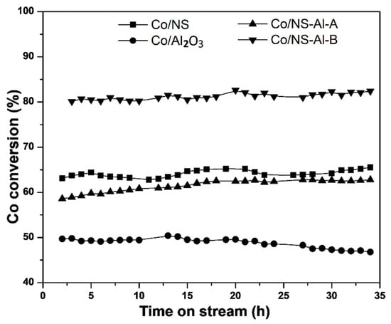 CO conversion as a function of the time on stream for the calcined Co/NS, Co/Al2O3, Co/NS-Al-A and Co/NS-Al-B catalysts.