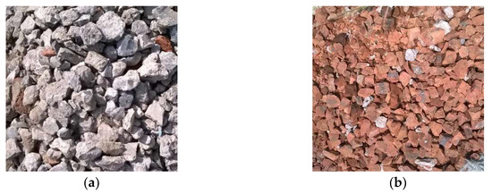 Figure 1. Recycled aggregates: (a) recycled concrete aggregate (RCA); (b) recycled brick aggregate (RBA).