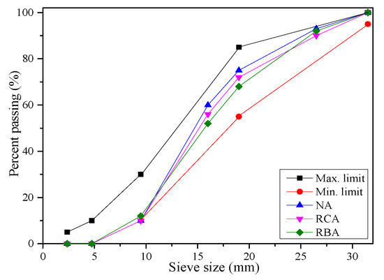 Portland cement (P.O. 42.5) with a ρc of 3100 kg/m3 is used as the binder. Normal river sand with a ρs of 2650 kg/m3 and fineness modulus of 2.75 is used as the fine aggregate for the mixtures. Coarse aggregates include NA, recycled concrete aggregate (RCA) and RBA. RCA and RBA are obtained from the abandoned concrete building and masonry walls near Hohai University, which are crushed and not pre-wetted for the mix process, as shown in Figure 1. The size of the uncrushed waste brick is 210 mm × 80 mm × 40 mm. The same series of sieves with sizes between 4.75–31.5 mm is used to ensure that the three coarse aggregates have the same continuous gradation. It should be noted that an aggregate fraction less than 5 mm is normally not used for RAC [21], so the sizes of most aggregates are between 10–30 mm. The grading curves of coarse aggregates are presented in Figure 2, which are in accordance with the maximum and minimum limits of Chinese standard GB/T 14685-2011 [22]. The properties (bulk density, apparent density, crushing index) of the coarse aggregates are tested according to Chinese standard JGJ 52-2006 [23] and the 24-h water absorption is tested separately according to GB/T 17431.2-2010 [24]. After soaking for 24 h, the water absorption of coarse aggregate is calculated according to Equation (1). Core drilling samples are taken from the parts with less stress or representative performance; then, the strength of random core drilling is tested according to Chinese standard JGJ T 384-2016 [25]. In summary, all properties are tested by three duplicate samples, and the average results are recorded in Table 1.