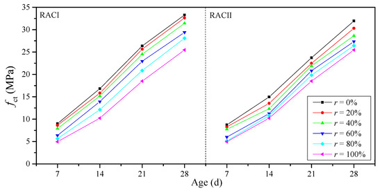 For an r below 40%, the fct of RACI stays in the same strength grade with normal concrete at the same age, and also exceeds 30 MPa at 28 days. For an r between 60% and 80%, the fct of RACI is about 5 MPa lower than the normal concrete at the same age, so these RACs should be used after considering a strength reduction. For RACI-100, the fct decreases by 45.18%, 39.22%, 29.84% and 23.48% at 7, 14, 21 and 28 days when compared with normal concrete, respectively.