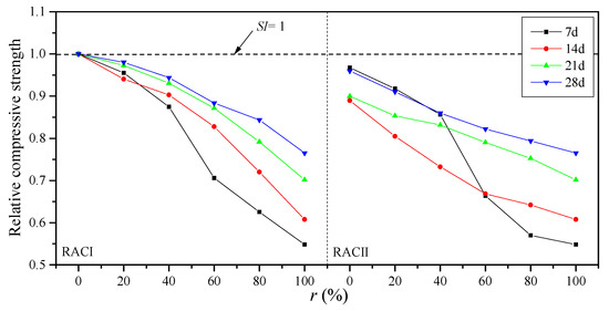 The SIs of RACI-20, RACI-40, RACI-60, RACI-80 and RACI-100 decrease by 4.47%, 12.52%, 29.42%, 37.48% and 45.18% when compared with SI = 1 at the age of 7 days, which confirms that there is an obvious strength reduction at an early age of RAC with RBA. The main reason is that RBA as a kind of lightweight aggregate has a similar strength to the early hardened cement paste, so the concrete strength is only determined by the cement paste at an early age. Hence, there should be a certain amount of early-age monitoring and maintenance while using this RBA concrete. From RACI-20 to RACI-100, the decrease of SIs changes from 1.97% to 23.48% compared with SI = 1 at the age of 28 days; similarly, from RACII-0 to RACII-100, the decrease of the SIs changes from 4.01% to 23.48%. The compressive strength should be determined by the aggregate itself at 28 days since the strength of cement mortar turns out to be stronger than the aggregates. The SIs of RACI and RACII have a rapid growth at a later curing age as a result of the high porosity and strong water absorption of RBA. The absorbed water in the mixing process is released during the cement hydration, so the RAC can maintain a certain internal temperature, which helps the curing and strength growth. The SIs of RACI and RACII decrease steadily when the r is below 40%; then, there is a significant drop once the r is higher than 60%, when the RBA with a low strength becomes the main coarse aggregate in RAC.