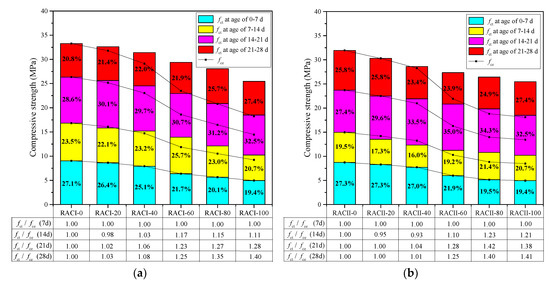 Figure 5. Compressive strength of RAC with RBA: (a) RACI; (b) RACII.