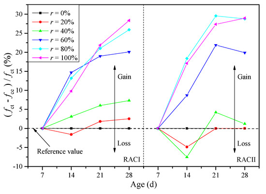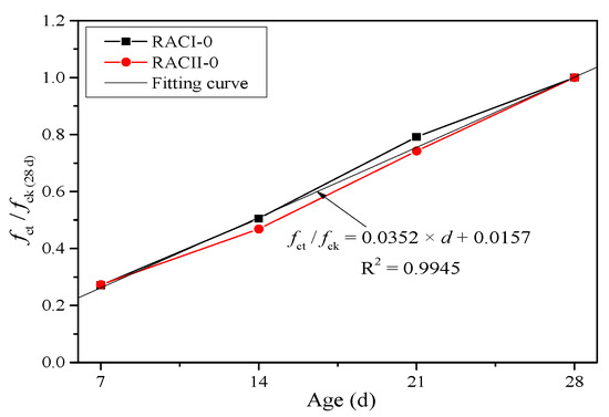 According to Chinese standard GB 50010-2010 [29], the compressive strength (fct) of cylindrical specimens (Φ150 mm × 300 mm) converted from the average compressive strength of cubic specimens (150 mm × 150 mm × 150 mm) at ages of 7, 14, 21 and 28 days are used. The conversion results are shown in Figure 3, and with the same r, the fct of RAC gradually increased with the curing age, which is similar to the normal concrete.