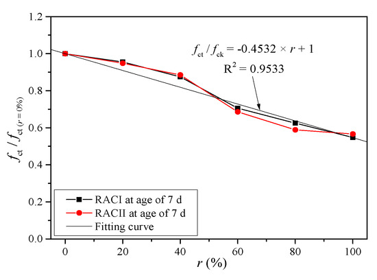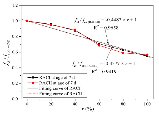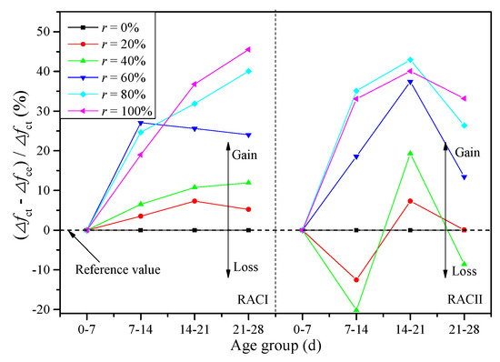 As expected, a higher r of RA would introduce more strength reductions in RAC due to the brittleness of RBA, but the internal curing effect of RBA will compensate this reduction. The internal curing effect of RACI (RACII) begins to appear after using the RBA, and the fct / fce increases from 1.00 to 1.40 (1.00 to 1.41) with the change of r (Figure 5). The fct of RAC with high RBA ratio at 21 days is even equal to the fce at 28 days. Combined with the aggregate property and the internal curing effect, the fct decreases slowly when the r is below 40%, then has a sudden drop after the r is beyond 60%. So, despite the obvious internal curing effect after 60%, the strength loss of RAC is more serious. Therefore, in order to ensure the performance of RAC while using as much RA as possible, this paper considers a 40–60% replacement ratio of RBA as the optimal value for both RACI and RACII.
