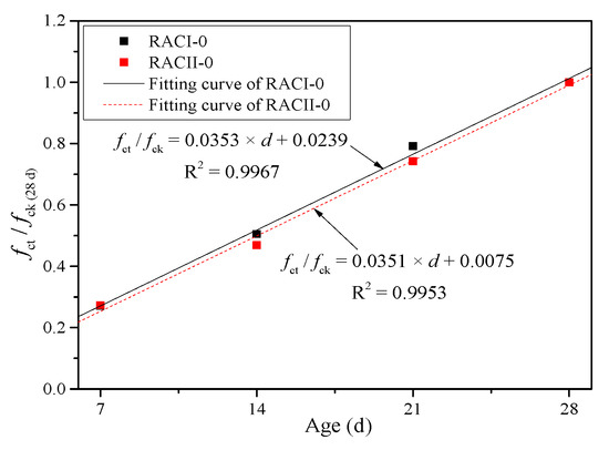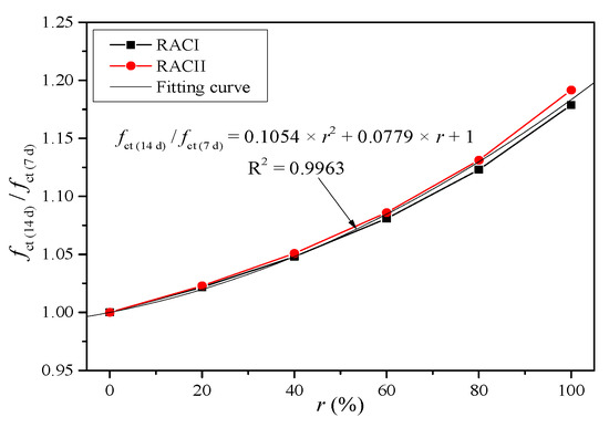 γ′ is the unified coefficient of aggregate type or internal curing effect. Similarly, γ14d′ can be taken from the fitting curve in Figure 14 based on the test results of RACI and RACII at the ages of 7 days and 14 days.