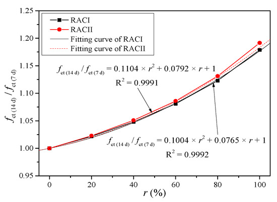 γ is the coefficient of aggregate type or internal curing effect. As mentioned above, the early compressive strength of RAC with RBA is low, but due to the powerful internal curing effect, the compressive strength increases at a faster rate after 14 days. Meanwhile, the internal curing effect is more obvious with a higher replacement ratio. Therefore, it is necessary to determine the γ according to the curing age and replacement ratio. Thus, γ14d can be taken from the curve fitting results of the compressive strength ratio between 14 days and 7 days, as shown in Figure 10.