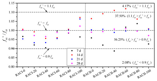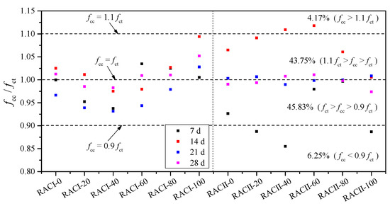 The comparison between the actual tested compressive strength fct and the calculated compressive strength fcc can be seen in Figure 11. The ratio of fcc / fct is between 0.855~1.118, the maximum deviation is about 14.5%, and more than 89.58% of the data are within the deviation range of 10%. Furthermore, the fcc / fct points to the ages of 21 days and 28 days basically being along the reference line of fcc = fct; thus, Equation (2) can reflect the compressive strength more accurately at the later curing age. In summary, there is a high degree of consistency between Equation (2) and the test results.