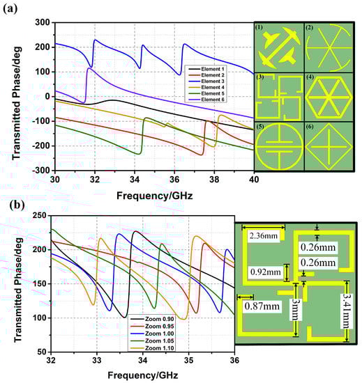 In order to achieve the frequency-diverse characteristic, metamaterial elements with different transmission phases from 32 GHz to 36 GHz, as shown in Figure 2a, are selected. From Figure 2a, different kinds of metamaterial elements have different transmission phases at the same frequency. Thus, different metamaterial elements distributed at different places would append different transmission phases when stimulated by the BCA, which results in frequency-diverse radiation patterns (i.e., a random distribution design).