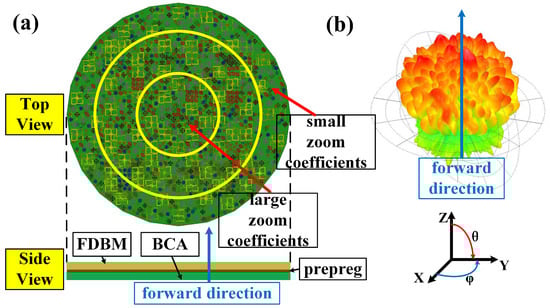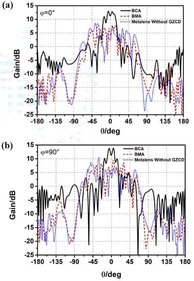 Comparison of radiation patterns of the BCA covered by a metalens without gradient zoom coefficient design (GZCD), the BCA, and the BMA; (a) ; (b) .