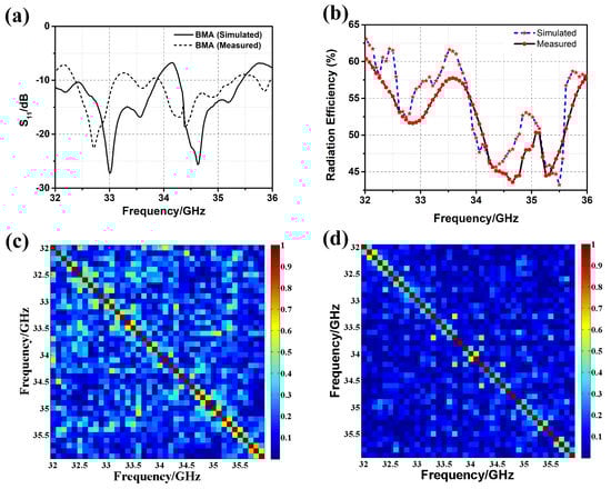The comparison of the simulated and measured (i.e., reflection coefficient) of the BMA is shown in Figure 6a. The was measured by the Agilent vector network analyzer (VNA) E8363B. The VNA and the coaxial cables were calibrated using short-open-load-thru (SOLT) calibration. The calibration kit was Agilent 85052D. Both the simulated and measured were under −10 dB from 32 GHz to 36 GHz, which proves that the BMA is well fed. The comparison of simulated and measured radiation efficiency is shown in Figure 6b. The average measured radiation efficiency was over 0.5 from 32 GHz to 36 GHz, which is a little lower than that of the simulated radiation efficiency. The BMA was designed for coincidence imaging that requires amounts of measurement modes. Different measurement modes used in coincidence imaging should be low-correlated [,]. Thus, the correlation coefficients of radiation patterns at different frequencies should be calculated as follows. Firstly, the amplitude and the phase of the radiation pattern at a specific frequency are arranged into two-dimensional matrices corresponding to the spatial distribution. Then, the amplitude matrix and the phase matrix constitute the complex matrix of the radiation pattern at this frequency. Finally, complex matrices of different frequencies are used to calculate the cross-correlations (i.e., the correlation coefficients of radiation patterns). The pixels, as shown in Figure 6c,d, represent the normalized correlation coefficients of the radiation patterns at the frequencies shown on the x-axis and the y-axis. As shown in Figure 6c, most correlation coefficients of the simulated frequency-diverse radiation patterns were under 0.4. Because of errors stemming from fabrication and measurement, most of the correlation coefficients of the measured frequency-diverse radiation patterns are under 0.3, as shown in Figure 6d, which is lower than those of the simulated radiation patterns. Both simulated and measured results promise good performance in the implementation of coincidence imaging.
