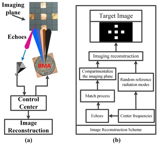 The schematic of the coincidence imaging is shown in Figure 7a. The BMA is used as the excitation and a horn antenna is used as the receiver to obtain the echo data. The target is in the 3 dB beamwidth of bunching random beams generated by the BMA. The radius of the BMA is 55 mm. The imaging distance is 50 cm. The flowchart of the coincidence imaging is shown in Figure 7b. The match process includes the target distance estimation and the match between the measurement modes and the echoes.