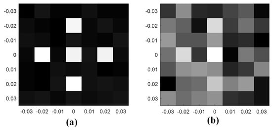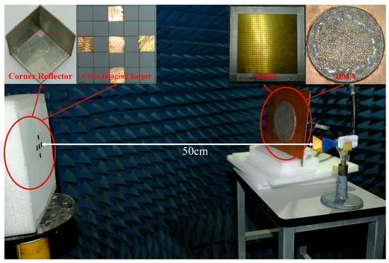 The scene of the coincidence imaging experiment is shown in Figure 8. In order to show the advantages of the BMA, a metamaterial aperture antenna (MAA) without bunching characteristic proposed in [] is selected for comparison. The side length of the MAA is 120 mm, which is approximately the diameter of the BMA. As shown in Figure 7, a corner reflector is used as the target to demonstrate the advantage of the bunching characteristic. The SNR of the receiving signal of the BMA is 6.3 dB higher than that of the MAA, which illustrates that the bunching characteristic can improve the SNR. Then the cross imaging target is placed at the imaging plane as shown in Figure 8. The imaging plane contains imaging cells and is equally discretized, where is in the azimuth direction and is in the pitch direction. The side length of the imaging cells is 1 cm (about 1/5 of the 3 dB beamwidth of the coherent transmitting aperture with the same size as the BMA) in both directions. The quality of the image can be evaluated by the entropy. The entropy of an image is defined as []
