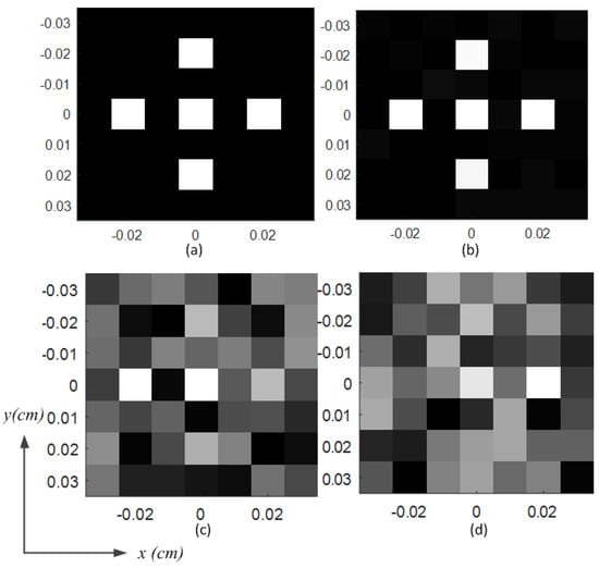 where is the measurement data, is the distribution of the measurement mode in the imaging plane, represents the discrete imaging point, is the scatting coefficient at the imaging point, represents the index of the tests, and is the measurement noise. Equation (1) can be solved using the fast iterative shrinkage threshold algorithm (FISTA) method [] or the conjugate gradient least squares algorithm (CGLSA), Ref. [] with high efficiency. Thus, the high-quality image can be reconstructed using all of the measured data of the BMA.