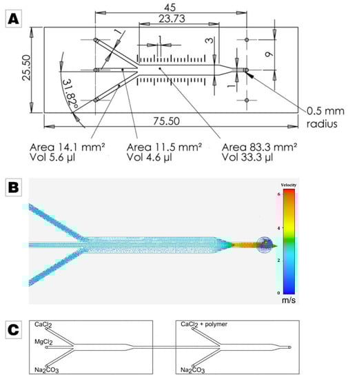 (A) Layout of the commercially available and employed microfluidic chip supplied by ibidi (Martinsried, Germany). Image used by courtesy of ibidi GmbH [53]. (B) Simulation of the fluid dynamics in the microfluidic chip at a feeding flow of 30 mL/min. Images used courtesy of ANSYS, Inc. (Canonsburg, PA, USA) (C) Scheme of the experimental setup. In control experiments, only the calcium chloride solution was fed into the system in the second microfluidic chip, thus omitting the addition of polymer.