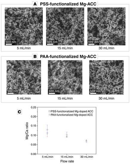 (A,B) Micrographs acquired by scanning electron microscopy of Mg-doped amorphous calium carbonate (ACC) functionalized by different polymers, i.e., sodium poly(4-styrenesulfonate) (PSS) or sodium polyacrylate (PAA), synthesized at different flow rates: 5 mL/min, 15 mL/min, and 30 mL/min. The morphology of the precipitate is unaffected by the flow rate and the polymer additive. (C) Inductively coupled plasma optical emission spectroscopy (ICP-OES) measurements of the doped ACC samples generated at different flow rates. The rate of Mg uptake is unaffected by the chemism of the polymer used for functionalization. With an increasing flow rate, the uptake of magnesium into the amorphous precipitate decreases.