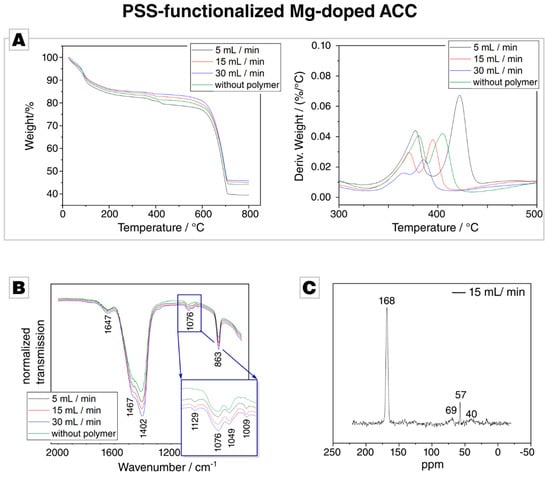 (A) Thermal gravimetric analysis (TGA) of ACC precipitated in the presence of PSS at different flow rates. (B) Attenuated total reflection Fourier transform infrared (ATR-FTIR) of the PSS and the Mg-doped control sample; the complete spectrum is provided in Figure S3A in the Supplementary Materials. (C) Cross-polarisation solid-state nuclear magnetic resonance (CP-MAS 13C–SS-NMR) of PAA-functionalized Mg-doped ACC synthesized at 15 mL/min. Other signals, e.g., at 57 ppm, arise from trace impurities such as residual ethanol or are insignificant to the signal/noise ratio.